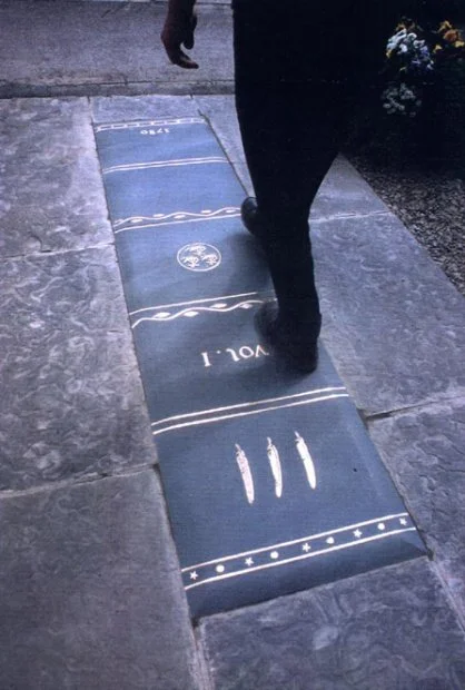 Description: Green slate pathway with pictorial detail in bronze embedded to suggest a book spine.