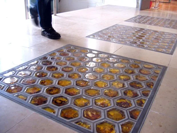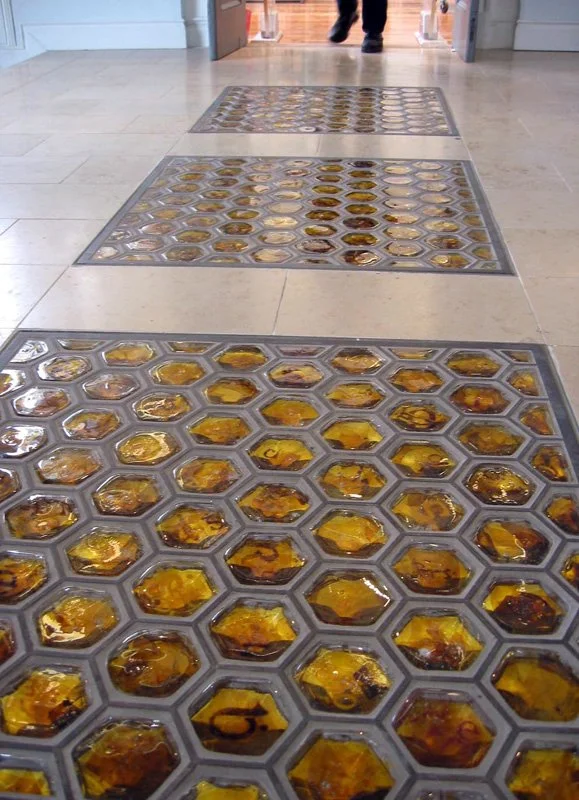 Description: The bee and honeycomb, its gathering and storing activities seems an appropriate symbol for a library. 3 hexagonal cast iron grids house honey amber cobbles. Glass cobbles have Irish type face letters embedded that appear like speckled powdered pollen. The lighting underneath creates a warm glow.