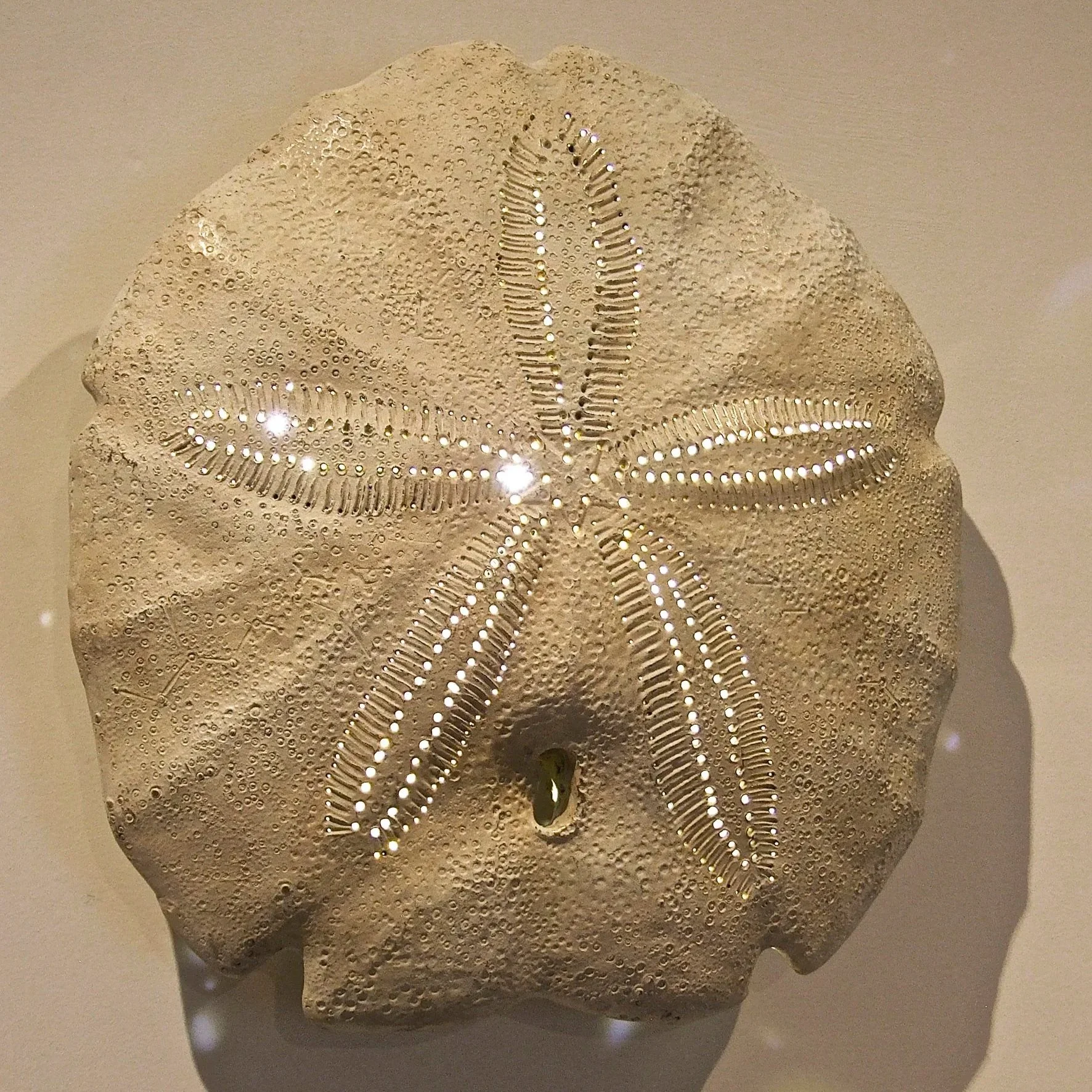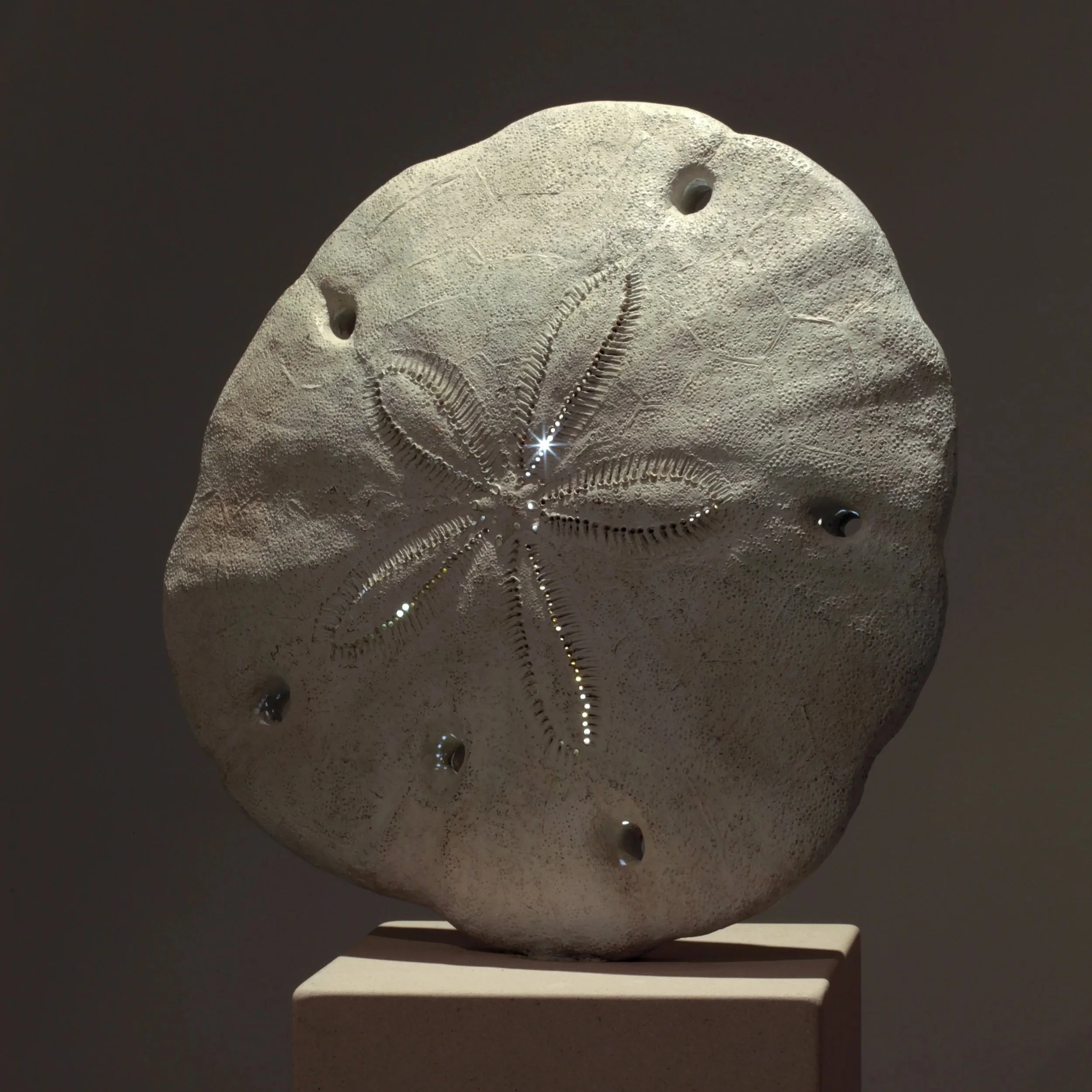 Joynt brings a level of delicacy and fragility to figurative sculpture that is based on the remnants of sensitive and fragile life forms that were once the inhabits of unpolluted pockets of ocean. She employs Echinoid Skeletons, in particular the sand dollar species, as a metaphor for richness and wealth and the search for rejuvenation and sustenance. These delicately perforated symmetrical forms emanate warm light and optimism in chalky opalescent colours. Permanence, transience and flux are reoccurring themes and her use of sand, light, precious metal dust, glass, bronze and cast iron communicates these concerns. For Joynt, scale is also important, transforming our normal viewpoint by using different magnifications, she allows the subject to take on a new presence.