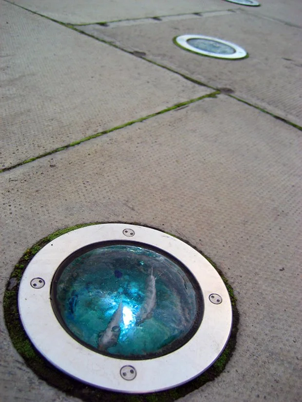 Description: 900 small glass cobbles in watery shades of green and blue with tiny metal silver and copper fish set inside. Each cobble is set into a light fitting and sited along a lengthy stretch of river walkway that suggests an almost surreptitious movement towards the sea.
