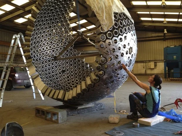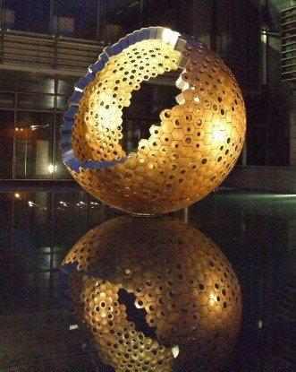 The 3 meter diameter sculpture entitled ‘Waggle Dance’, is made from curved plate bronze perforated by various size holes revealing an internal stainless steel, cellular substructure.