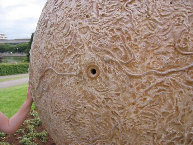 Description: The egg as a symbol of growth and potential life is richly featured with sperm-like shapes of various creatures including man, bull, rabbit and hamster. The bronze is perforated with small holes and when viewed through the eye hole this creates a celestial space.