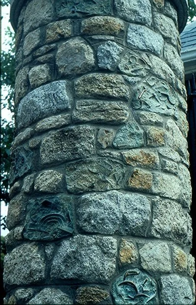 Description: Bronze blocks incorporated intermittently into stonework on four pillars at entrance. ‘Fossil like’ objects embedded to reveal horse tackle i.e. stirrups, bits, stirrups etc. An original stable yard existed on this site.